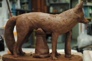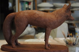 Piece is made solid, with external supports. I don’t like using internal armatures, so until the legs stiffen up a bit I support the body with a brick with a clay pad on top for shrinkage. The legs are just barely touching the ground at this stage. Other supports may be needed, depending on the pose. Chopsticks with a clay pad on each end work well.